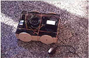 "Die optomechanische Konfiguration zur Herstellung der Sargfotos. Die Kamera und die Blitzanlage befinden sich dabei auf einem kleinen Wagen, der vermittels einer Stange exakt an den jeweiligen Segmentabschnitt gefahren werden kann. Die Auslösung erfolgt pneumatisch." | Für den Weitertransport des Films sorgt ein angesetzter Motor. So kann in 24 Schritten ein exakter Plan der Unterseite erstellt werden. Später wurden diese Segmentaufnahmen im Computer zu einer Komplettansicht der Unterseite des Sarkophags zusammengesetzt."