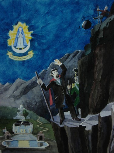Der König mutig voran, hinter ihm sein getreuer Diener Thomas Osterauer. Hoch über dem Haupt des Königs tritt ein Attentäter den Steinklotz los, der den König aber gottlob um Haaresbreite verfehlt!